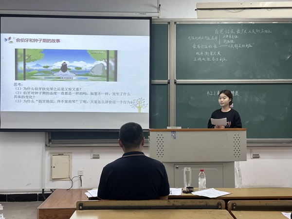 活动伊始,周屿珩介绍模拟授课规则及到场评委老师,鼓励员工在教学中厚植德育内涵,提升综合育人能力。随后,模拟授课环节,员工们运用多媒体技术创设教学情境,通过互动问答、小组合作、案例分析等形式,展现课堂驾驭能力。“教育不仅是知识传递,更是价值观塑造”,刘玖以“划船去无人岛探索”为切入点,将“人满足他人需要的属性及人的价值在于创造”的德育元素巧妙融入知识讲解,生动诠释了课程思政的育人价值。评委老师结合教学实践案例,针对课堂节奏把控、课堂氛围轻松、课件展示重点等问题提出改进建议,帮助员工明晰教学短板。