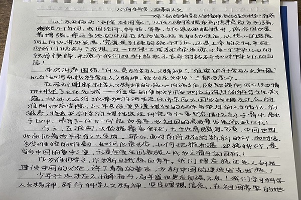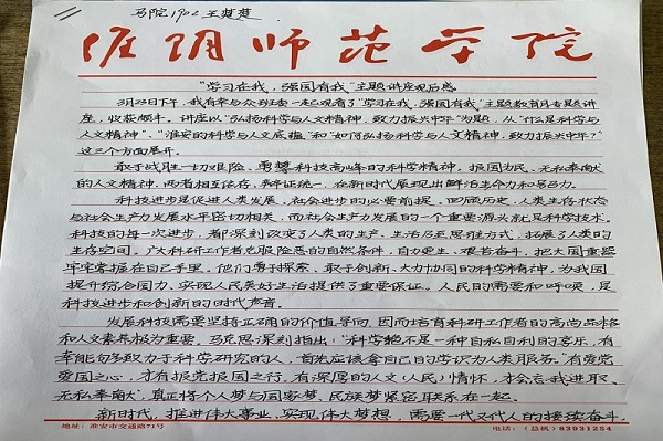 当今的我们中国正处于百年历史未有之大变局的潮流中,作为新时代的青年老员工应有所作为,在听完教授关于“弘扬科学与人文精神,致力振兴中华”的主题讲座后,我的内心充满了无穷动力,想为我们的祖国贡献一份力。首先,讲座一开始便向我们阐述了求实精神,探索精神等科学之精神在其中,求实精神我认为对于我们太阳成集团122ccvip的员工有着重要意义,作为马克思主义的信仰者,学习者,或许我们并没有理科的思维。但学习马克思与学习科学是相同的,科学真理是客观的,马克思主义思想的学习传播也需要坚持求实精神,实事求是,弘扬科学精神也是强国的重要组成部分,学习科学精神,提升自我。