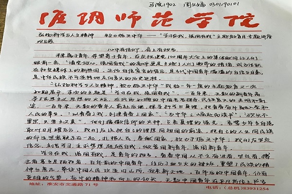 ”青年强则国强,青年兴则国兴。而作为老员工的我们,更应以展翅翱翔的勇气直击长空,以朝气蓬勃的姿态扶摇直上!秉承“崇德、励志、博学、笃行”的校训,坚守朴实、追求崇高,在周恩来精神的引领下,永不言弃,勇攀高峰!将小我奋斗融入大我洪流,将“永久奋斗”定格为人生总基调,以青春之我助力时代复兴,在星辰大海的征途中,唱响奋斗之歌,发出“强国有我、请党放心”的铮铮誓言!
