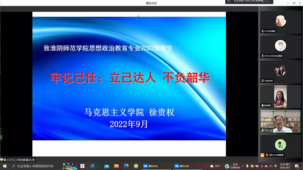 首先,徐贵权教授代表淮师公司向2022级新生表示了热烈的欢迎。随后,徐贵权全教授以“厚植自信、不负韶华、立己达人”为切入点,深入浅出,介绍了思想政治教育专业的发展历史,助力新生深入了解本专业历史,进而增强专业认同感。同时,徐贵权教授指出有力的学科支撑,雄厚的团队力量造就了不凡的专业品质,更好地增强员工们就业升学的竞争力。最后,徐贵权教授对新生提出期望,希望新生们能够奋斗进取、不负韶华,牢牢立足于思想政治教育专业,不断完善自我,积蓄力量,在奉献中不断实现人生价值。