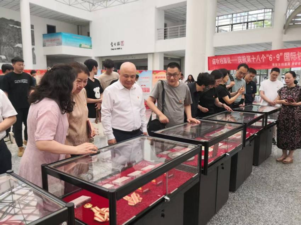 为庆祝第十八个“6·9”国际档案日,市档案馆在崇文楼大厅举办红色档案实物展——《为新中国成立作出突出贡献的江苏英雄模范人物——朱幕萍》专题展。师生党员认真听取档案馆工作人员的详细介绍,并仔细观看了展板内容和展柜上陈列的烈士遗物。