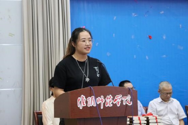 最后,19级员工谭译作为新生代表分享了自己初来淮师的所见、所闻与所感。满怀着对大学未来生活的憧憬,她与19级新生共勉:一是尽快融入公司,适应大学的节奏;二是树立远大理想,让理想指引前行的方向;三是团结友爱同学。最后,她代表全体新生发出大学奋斗的誓言:青春无悔,未来可期。
