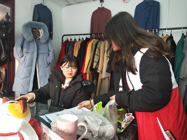 图为员工党员走入商铺。 记者 何静怡 摄