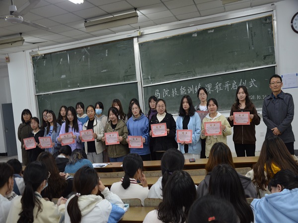 仪式开始,张思棋简要说明了技能训练部的作用以及对接下来教学工作的安排。紧接着,技能训练部副部长李雪雯、林柯上台发言,他们强调师范生的技能训练尤其重要,希望20级教学员认真上好每一节课,21级新生积极配合教学员。随后19级教学员周文嫣和王楚楚向20级教学员们传授经验并希望21级新生能够积极参与课堂互动。