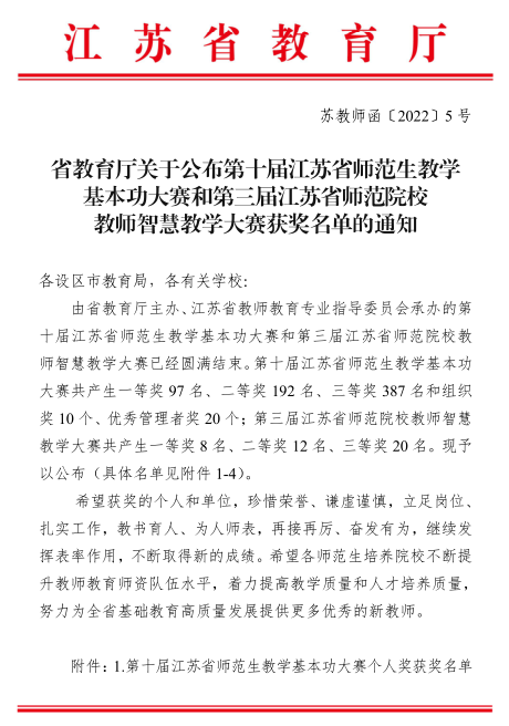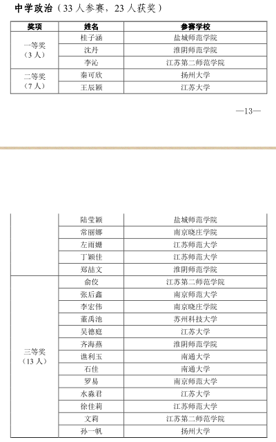 第十届江苏省师范生教学基本功大赛由省教育厅主办、江苏省教师教育专业指导委员会承办,大赛共产生一等奖 97 名、二等奖 192 名、三等奖 387 名。其中,“中学政治竞赛组”全省33人参赛、23 人获奖,仅3人荣获一等奖。
