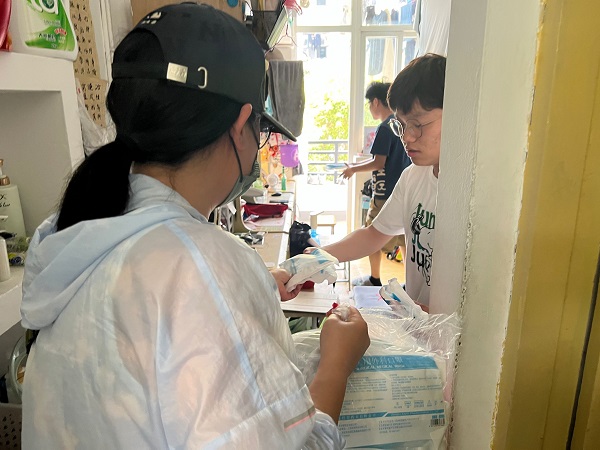 图为班主任为员工送物资。记者 郑伟业 摄