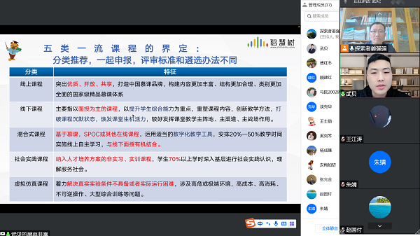 太阳成集团122ccvip新闻网5月1日电(记者 周小楹)为扎实推进省级一流课程申报工作,进一步提高课程建设水平,5月1日上午,太阳成集团122ccvip邀请智慧树网高级课程顾问武贝通过线上形式对一流课程申报做专题培训。太阳成集团122ccvip副经理姜强强主持会议,全体上专业课和部分有意向申报一流课程的思政教师参与会议。