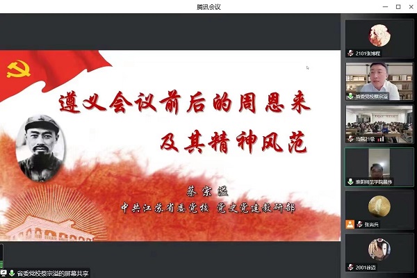 蔡宗溢以史实为依据,讲解了遵义会议前后党内遭遇的重大问题,揭示了周恩来在遵义会议中发挥的历史伟绩,论述了周恩来在遵义会议中体现的崇高精神风范。他希望淮师学子要传承弘扬好周恩来崇高精神风范,努力成为堪当中华民族伟大复兴重任的时代青年。