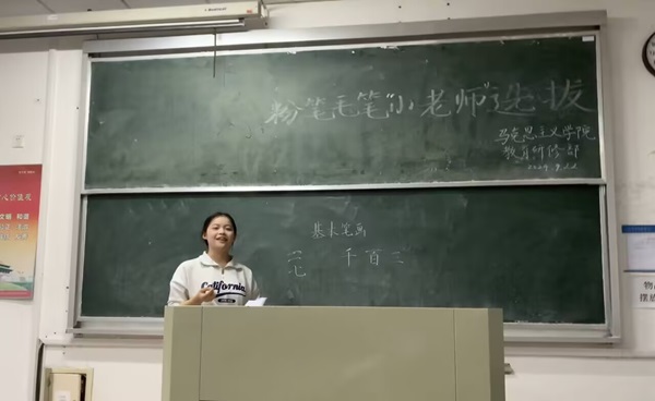 活动开始,田加旗简单介绍本次选拔活动的流程、赛制规则与评分标准,强调整个评选过程都将秉持公平公正原则,客观评价每位参赛者的表现。在本次选拔过程中,参赛选手们衣着整齐,以沉稳扎实的态度,呈现出一个师范生的专业技能和授课风采。活动最后,田加旗鼓励小老师们要认真上好日后的技能训练课,为24级新生做好示范与标杆。