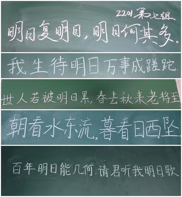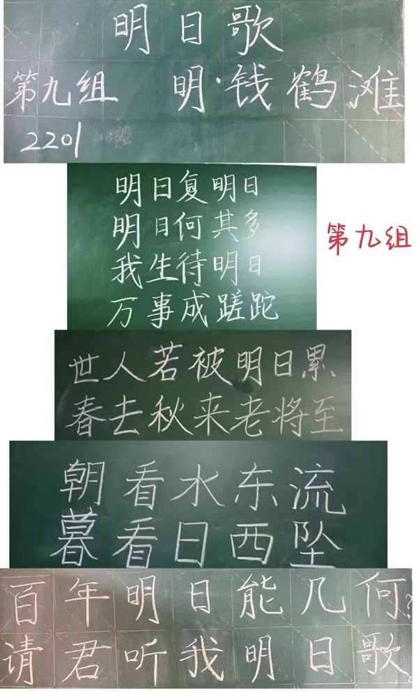 大一年级共设十八组,每组组长为教育研修部干事。小组学习在基本笔画学习的基础上,着重发展员工对字的间架结构的学习。分组时大家观察每位组长的字的框架结构,自行挑选最适合自己的组长。每位组长负责四到五名同学,减少了小老师的负担,提升了课堂学习效率,通过近距离的辅导提升了小组成员的书法水平。随着学习小组制度的落实,本次教育研修部举办活动首次增加小组赛。小组成员用粉笔共同完成《明日歌》的书写。希望大家在书写中体会珍惜时光的重要性,不要因为永远等待明日而浪费时间、蹉跎光阴,让老员工活的每一天都过得充实有意义。