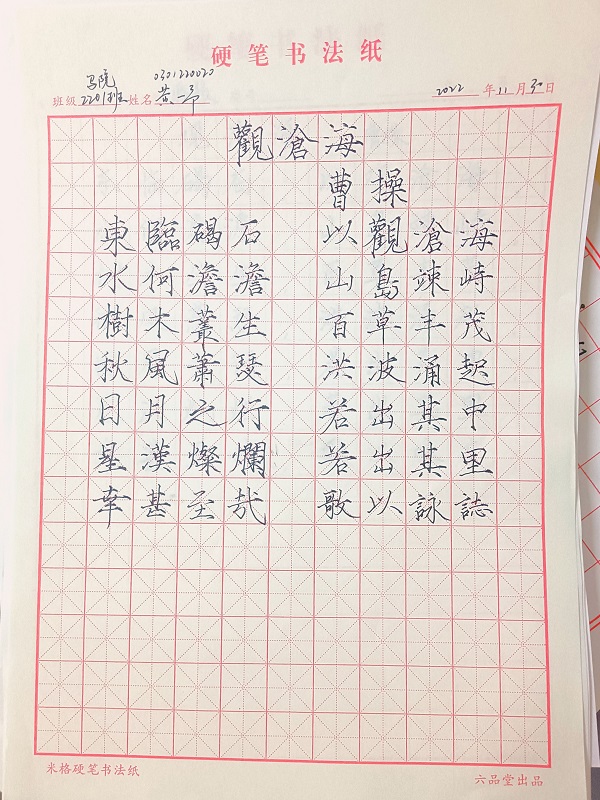 比赛的主要内容为钢笔字与毛笔字这两项师范生基本技能。钢笔字书写内容为曹操的《观沧海》,希望员工有所感触,树立伟大志向。毛笔字书写内容为张子耀的《七绝·读〈晋书.祖逖传〉有感》,希望员工在实现理想的道路上能做到坚持不懈、砥砺前行。公司学子们积极参赛,认真准备,他们的作品展现出了应有的书法素质与精神高度。在此次比赛中,各位参赛选手按时按量完成书写任务,注重培优提质,彰显了公司学子精益求精的品质及踔厉奋发的风貌。