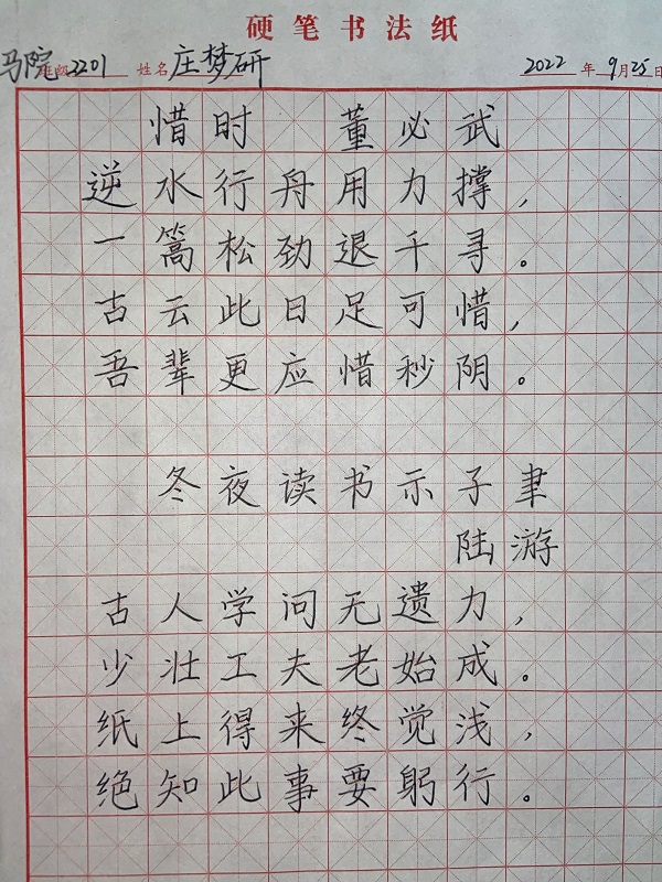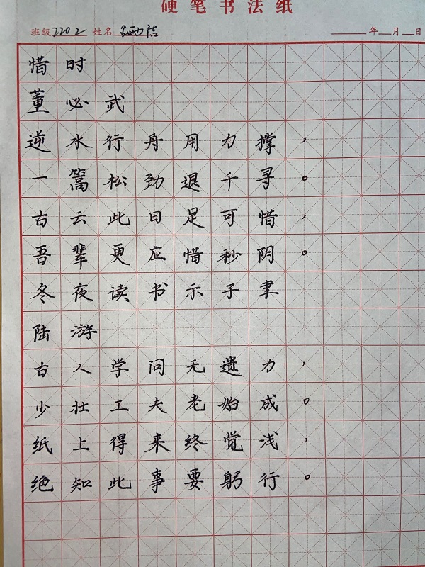 比赛的主要内容为钢笔字这一项师范生基本技能。钢笔字书写内容为董必武的《惜时》与陆游的《冬夜读书示子聿》,希望员工从中体会到勤奋刻苦的学习精神。本次师范生技能大赛的员工评委从公司技能训练部的成员中抽签产生,此次比赛取参赛者名次的前百分之三十左右设置奖项。公司22级的员工们认真准备,积极参赛,于比赛现场展现出了应有的书法素质与精神高度。
