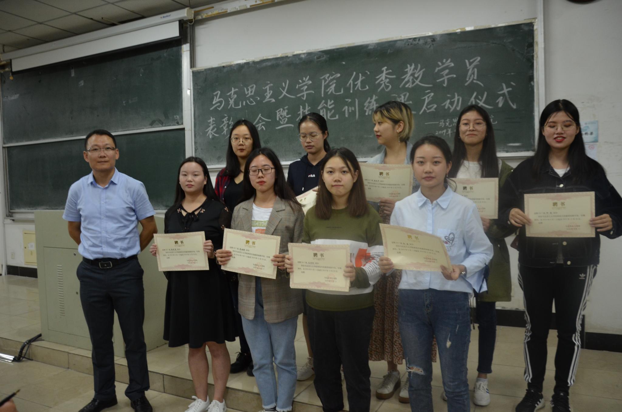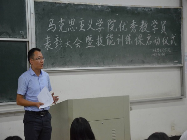 姜强强副经理对上学期的优秀师范生技能训练教学员进行了表彰,并对2017、2018级教学员颁发聘书,对徐望晨授予顾问聘书。他以毕业1至8年的毕业生调研为例,强调技能训练对师范生的重要性。他要求员工必须牢牢把握师范生技能,遵守纪律,尊重教员,寄语全体师范生“学无止境,练无止境,提升无止境”。