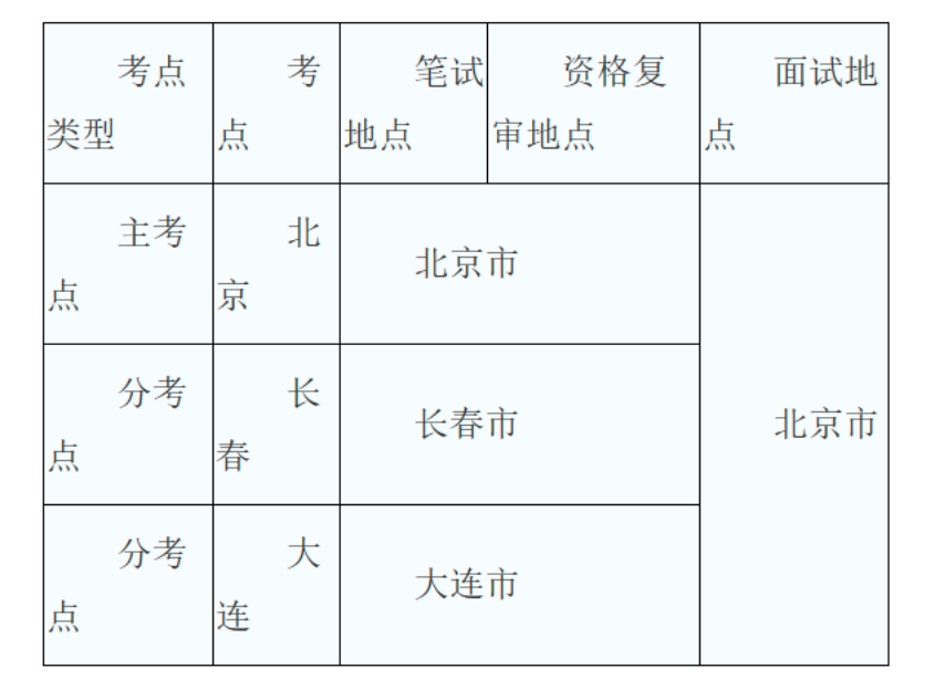 特别提醒:报考分考点长春和大连岗位的考生,如通过笔试和资格复审环节,需前往主考点北京市参加面试。
