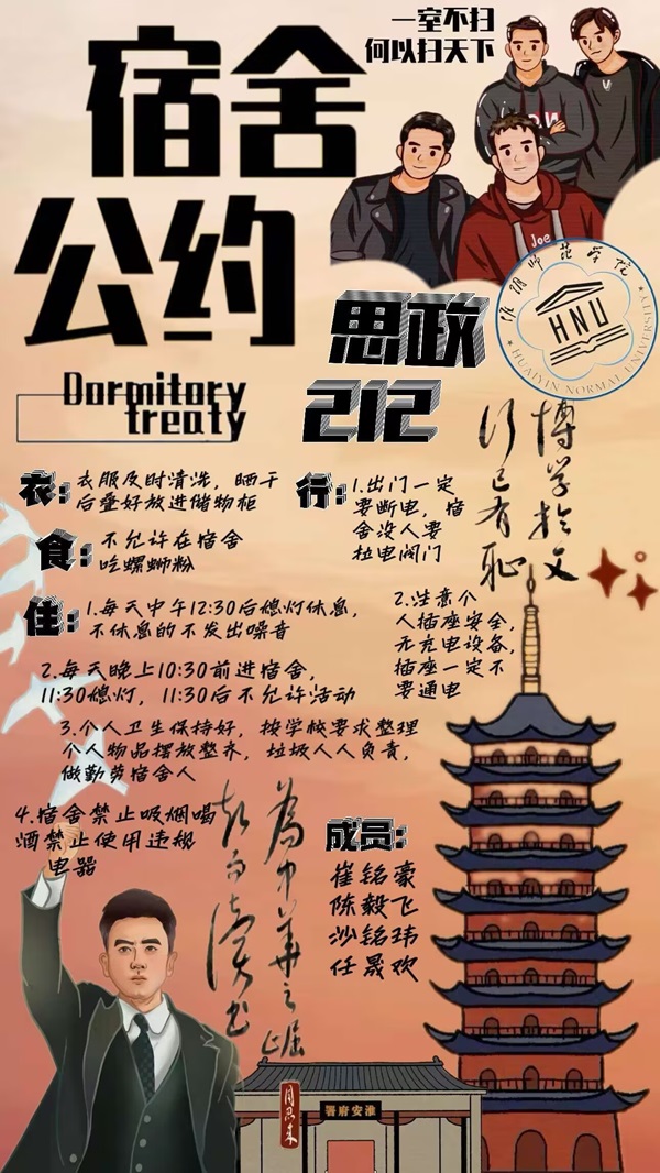 在活动一--宿舍公约设计大赛中,员工们以宿舍为单位,围绕卫生习惯、学习生活习惯、宿舍安全用电、舍友和谐相处等方面内容,制定宿舍公约并设计出属于本宿舍的宿舍公约海报。在活动二--宿舍文化装饰大赛中,员工们以宿舍为单位,融合公司专业特色、淮师校园文化、淮安当地文化以及周恩来精神等元素对宿舍进行装饰,将宿舍打造成干净、整洁、具有特色的文明寝室。
