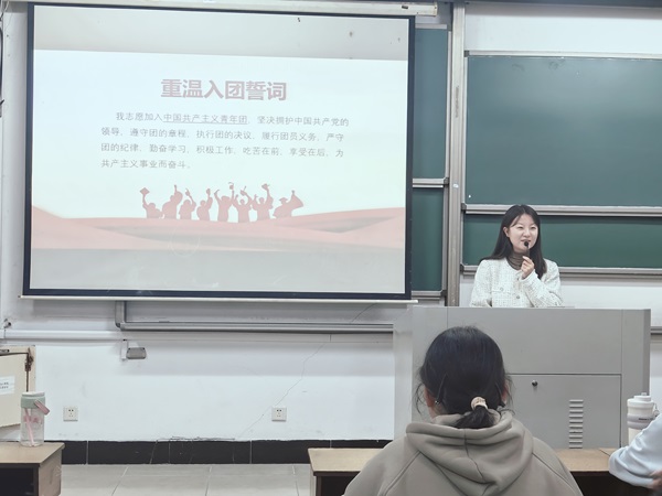 团课最后,在庄重肃穆的氛围中,全体新生团员重温了入团誓词,铮铮誓言响彻教室,点燃了同学们的理想热情。大家纷纷表示,将珍惜大学时光,积极发挥共青团员的先锋模范作用,以青春奋斗为底色,以责任担当为标尺,为实现中华民族伟大复兴贡献青春力量!