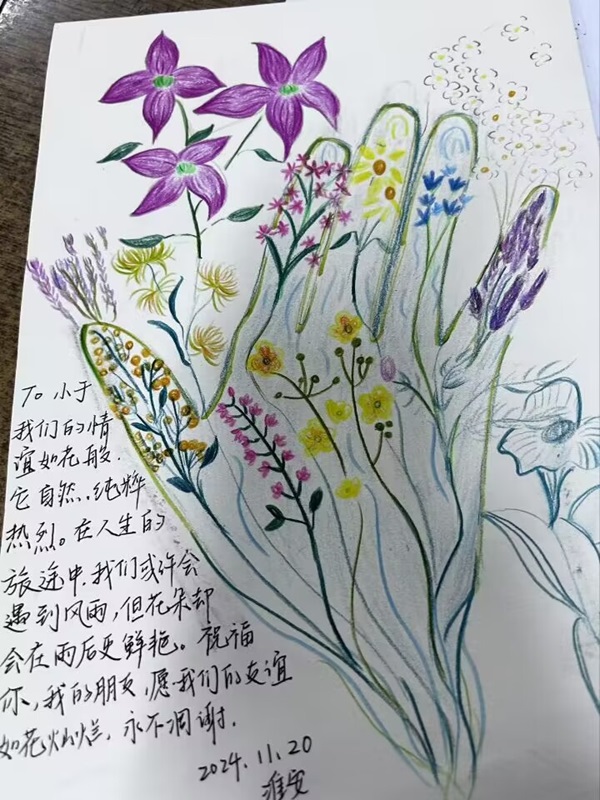 活动伊始,刘梦琪简要介绍了本次活动的内容和要求。然后员工们自由选择画笔的颜色,将自己的手掌轮廓描摹在画纸上,并发挥想象,用色彩斑斓的线条和图案装饰手掌。在绘制过程中,员工们发挥想象力,激发创意灵感,通过团队成员之间的互动与合作,增强了凝聚力。最后员工们在绘制好的手掌旁边,写下自己心中的温暖寄语。这些寄语承载着满满的爱与温暖,开启了一场心灵共鸣的奇妙旅程。活动结束后,员工们纷纷表示,本次活动让他们在轻松愉快的氛围中放松了心情,缓解了生活和学习中的压力。