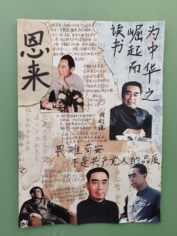 活动中,员工们围绕周恩来总理崇高精神风范以及安全主题,结合周总理参与的重要会议和谈判场景绘制海报;选取周恩来经典语录进行书法创作、制作拼贴画等进行宿舍装扮,将周恩来总理的精神元素融入宿舍文化建设,深入学习周恩来总理的生平事迹,感悟其“革命理想高于天”的坚定信念和“人民至上”的崇高品格。