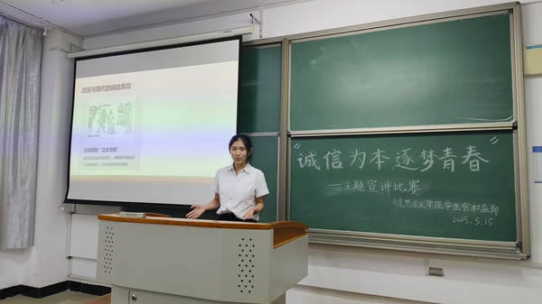 活动伊始,权益部部长林妍希介绍了本次活动的相关情况,并强调诚信的重要性。随后,选手们依次登台,用生动的故事诠释着诚信在青春岁月中的重要意义,有的选手从自身经历出发,讲述在学习生活中因诚信而收获的温暖与成长;有的则以历史典故为引,阐述诚信自古以来便是成就事业的关键基石。活动尾声,王勇胜老师呼吁广大青年以此次活动为契机,将诚信融入日常生活的点滴之中,用诚信书写青春华章,用行动追逐梦想之光。
