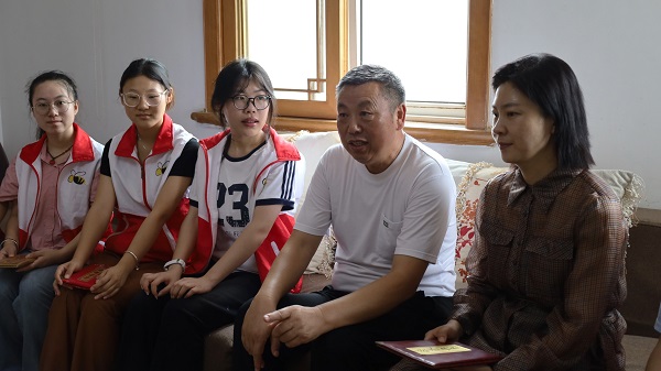 在社区工作人员的引导下,小分队首先来到85岁高龄的退伍军人、老党员李爷爷家中。李爷爷精神矍铄,声音洪亮,说起话来思路清晰。他小心翼翼地拿出珍藏的报纸,泛黄的纸张上,身着军装的他英姿飒爽。随后,李爷爷又郑重地展示了那枚熠熠生辉的国家颁发的入党50周年纪念章。“这枚纪念章承载着党对我的信任与肯定。”李爷爷深情地说,他鼓励同学们要珍惜当下的学习时光,努力提升自己,积极向党组织靠拢,为实现中华民族伟大复兴的中国梦贡献青春力量。