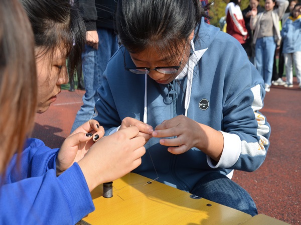 图为比赛项目穿针引线。 记者 周文嫣 摄