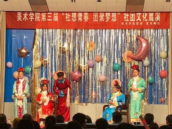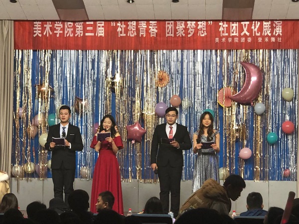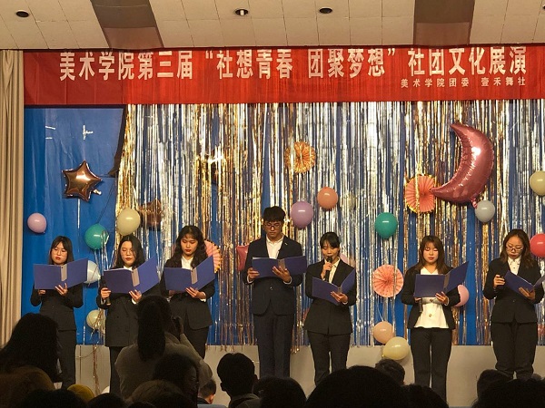 公司网12月2日电(记者 王雪婷)十二月踏着她那轻盈的步伐悄然而至,夜晚寒风凛冽,但依旧挡不住同学们的热情似火,欢歌笑语。12月1日晚,由美术公司团委与青年马克思主义研究学社联合承办的以“社想青春,团聚梦想”为主题的社团文化展演在逸夫报告厅火热开演。美术公司团委第一副书记顾思骋、员工会主席穆日龙、团委副书记夏振华老师和辅导员费名扬老师等人亲临现场,与同学们共同观看了整场演出。