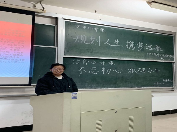 首先,由唐金蕾同学给我们带来以“无奋斗 不青春”为主题的授课,她以萧煌奇身患先天白内障却坚持歌唱创作梦想为例,向大家展示了一个身残志坚、脚踏实地的奋斗传奇。紧接着,吴冬梅同学和大家分享了中国女排历经曲折坎坷,2019年以十连胜的战绩提前一轮获得世界杯冠军的故事,启发同学们不论是在学习还是生活中遇到困难时都要永不放弃,秉持中国女排精神。在公开课的最后,王洁同学向同学们介绍了一部电视连续剧《可爱的中国》,这部剧以方志敏为创作原型,讲述了他投身革命,为中国人民解放事业无私奉献的一生,教育同学们要懂得奋斗之于国家、民族、个体的意义,传承不息的红色基因,为今日中国之发展与民族之复兴奉献青春力量。此外,活动以习近平总书记的话“现在,青春是用来奋斗的;将来,青春是用来回忆的”作为结语。