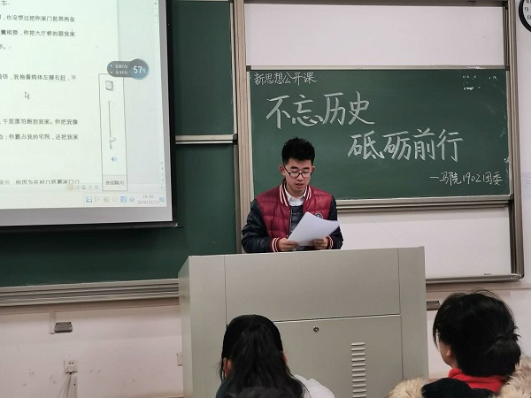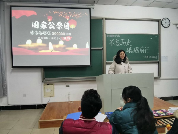 公司网12月14日电(记者 姚欣怡)12月13日,太阳成集团122ccvip1902班为纪念国家公祭日于综北103开展以“不忘历史 砥砺前行”为主题的新思想公开课,公开课由1902班团支书谭译主持。