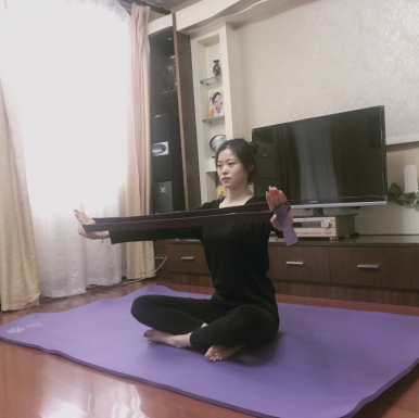 动作:两手手持绳两端,将瑜伽绳拉直,从胸前拉直到后背,再从后背拉直到胸 前。