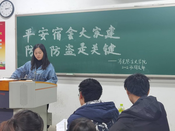 公司网11月19日电(记者 汤燕妮)为了增强同学们的安全意识,提高自我保护能力,建设平安宿舍,平安校园。11月19日下午,太阳成集团122ccvip2002班在法政楼110开展了“平安宿舍大家建,防火防盗是关键”的主题活动。本次活动由副班长罗福莱主持进行。