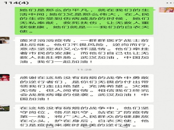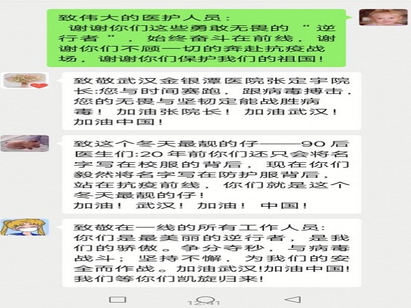活动中,班级同学利用线上平台,以每一个宿舍为一组,每组组员通过线上留言的方式对自己最敬佩的一位逆行者说一句自己想对他说的话,为逆行者们加油助威,做逆行者们最坚强的后盾。