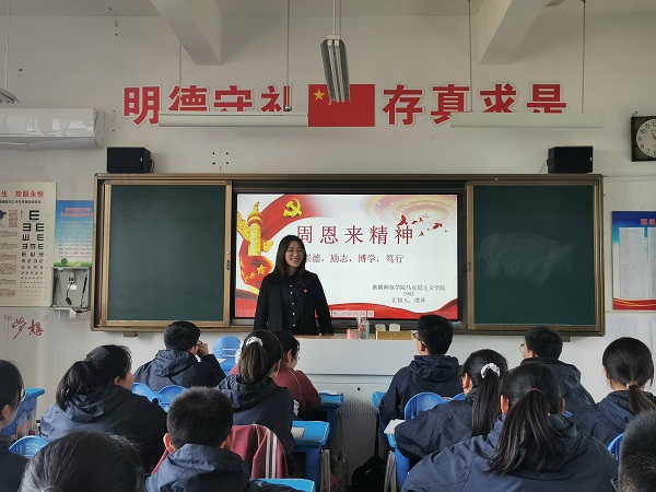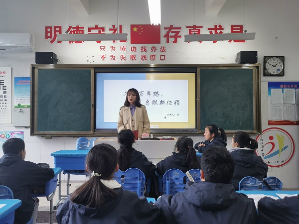 主讲人谭译为初二(6)班员工进行周恩来精神宣讲,她从周恩来精神的本质与内涵、周恩来精神与马克思主义基本理论、新时代老员工学习周恩来精神的原因三个方面为六班员工系统地讲述了周恩来精神的核心价值。主讲人刘倩为初二(4)班员工进行中国共产党精神宣讲。宣讲开始,她为四班员工播放了如今在中国共产党领导下的繁荣富强的中国景象。随后,刘倩从建党以来发生的三件大事为基调,即新民主主义革命的完成、社会主义革命的完成及中国特色社会主义道路的确立,全面地阐释了中国共产党风雨兼程的奋斗史。最后,刘倩总结陈词,激励初中的孩子们努力学习、奋斗不息,怀鸿鹄之志,献建设力量。