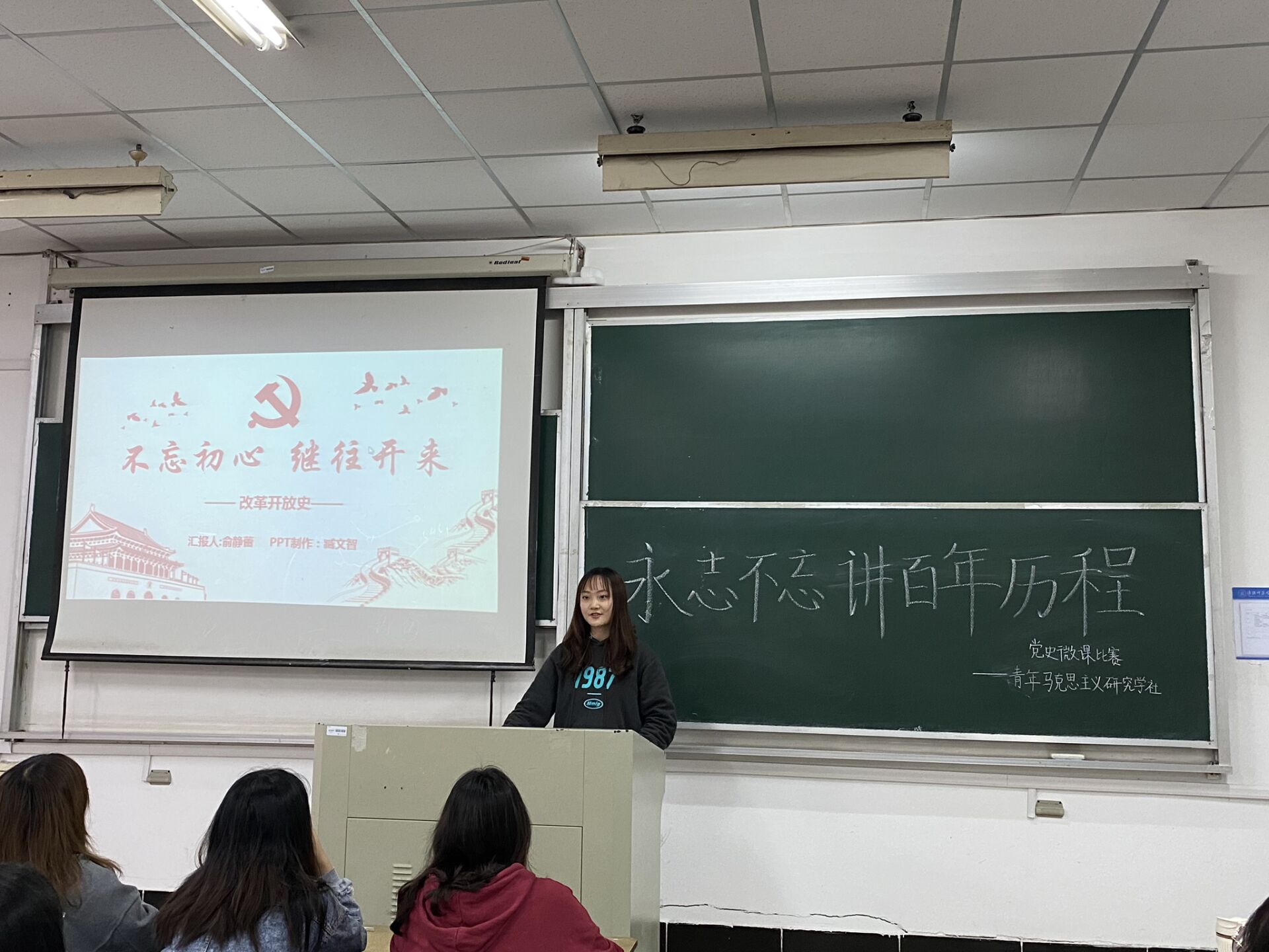 公司网4月24日电(记者 孔令妤)为庆祝中国共产党建党一百周年,深入贯彻落实习近平总书记在党史学习教育动员大会上的讲话精神,进一步规范思政师范生的专业技能,公司三个社团联合组织开展“永志不忘,讲百年历程”微课比赛活动。青马学社主持“改革开放史”赛道。