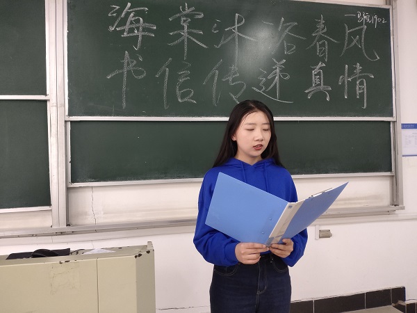 活动开始前,班级成员以自荐或推荐的方式遴选出8位朗诵者,各朗诵者自行准备朗诵文稿与背景音。活动开始,马晨晨作活动介绍,她指出,周恩来与邓颖超两位革命者的浪漫融入到了对人民、对国家的无私大爱中。两人之间的往来书信,承载着他们为共同理想而携手奋斗的岁月情深。随后,朗诵者分别对所选信件进行朗诵。朗诵者们声情并茂、抑扬顿挫,表现力极强,带领听者走进上世纪的悲欢离合,感受蕴藏在书信中的红色记忆。