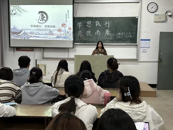 首先,团支书邓云芸带领员工们学习了“明理知耻”、“崇德尚廉”、“仁爱和谐”等古人先训,勉励员工们坚定理想信念,自觉主动地培育和践行社会主义核心价值观,积极营崇德尚廉的文化氛围。随后,员工们牢牢立足于自身专业特性,围绕本次活动主题,有序上台进行模拟授课,在实践中提高了自身的专业素质与实际本领。最后,团支书对本次活动进行了总结,帮助员工们进一步理解学思践行,崇德尚廉的精神内涵,员工们深受启发,立志将廉洁意识内化于心、外化于行、固化于治、知行统一。