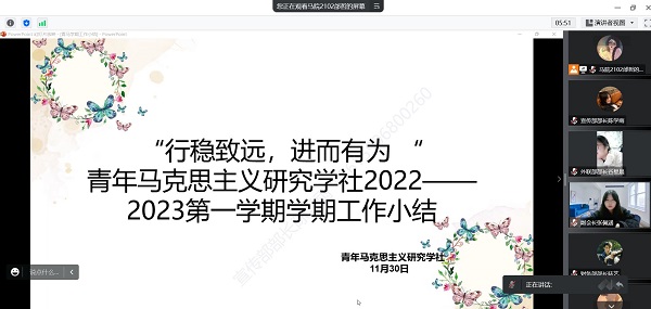 公司网11月30日电(记者 陈学雨 邰哲)11月30日晚,青年马克思主义学社于线上开展了“行稳致远,进而有为”学期工作总结会议,本次会议由青马会长邰哲主持,指导老师曹兴江、20级青马负责人应邀参加,青马学社全体成员参与。