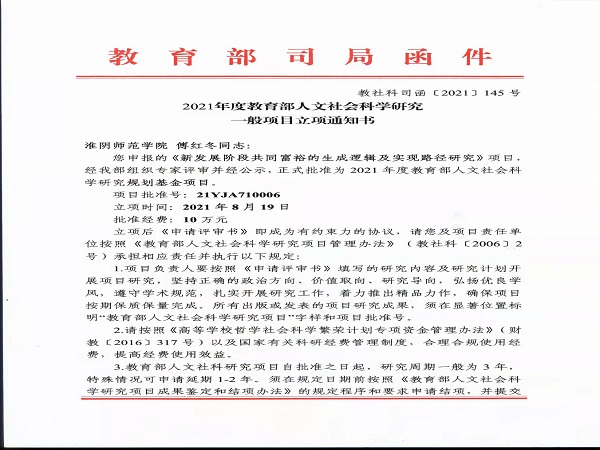 近日,传来喜讯,公司韩同友教授申报的“大中小学思政课一体化建设时空融合机制创新研究”获批江苏省社科基金一般项目资助,傅红冬教授申报的“新发展阶段共同富裕的生成逻辑及实践路径研究”获批教育部人文社科基金一般项目资助。
