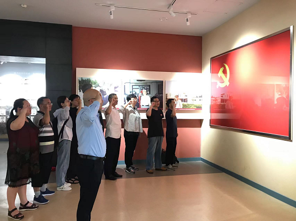 支部成员缓步参观了八十二烈士纪念馆。纪念馆中的一张张照片和一段段文字记录了刘老庄战役的历史背景,生动回顾革命先烈为抗战胜利不畏强暴、英勇抗争的一个个感人瞬间,诠释了“服从大局、严守纪律,敢打硬拼、英勇善战,顽强拼搏、勇于牺牲,生命不息、战斗不止”的刘老庄连精神。两支部成员在纪念馆二楼的党旗下重温入党誓词,用铮铮誓言告慰英灵。